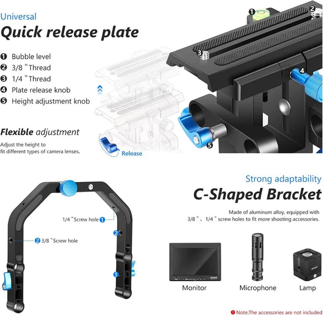 The Neewer Professional Shoulder Rig is perfect for professional filmmakers who need a complete and versatile system that can be used with a variety of cameras and accessories. It's also great for hobbyists who want to take their filmmaking to the next level. The rig provides stability and comfort while shooting, allowing you to capture smooth and professional-looking footage. It's ideal for shooting low-angle shots or filming moving subjects, thanks to the comfortable handgrips and shoulder pad. The matte box and follow focus allow you to control the light and focus of your shots, ensuring that your footage looks clear and sharp. With multiple 1/4” and 3/8” female threads, you can add additional accessories, such as microphones or monitors, to your rig to help you get the perfect shot.