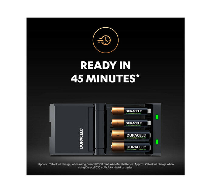 - Ready in 4 hours* (Approx. 90% of full charge, when using Duracell 1300 mAh AA NiMH batteries. Approx. 80% of full charge when using Duracell 750 mAh AAA NiMH batteries.)